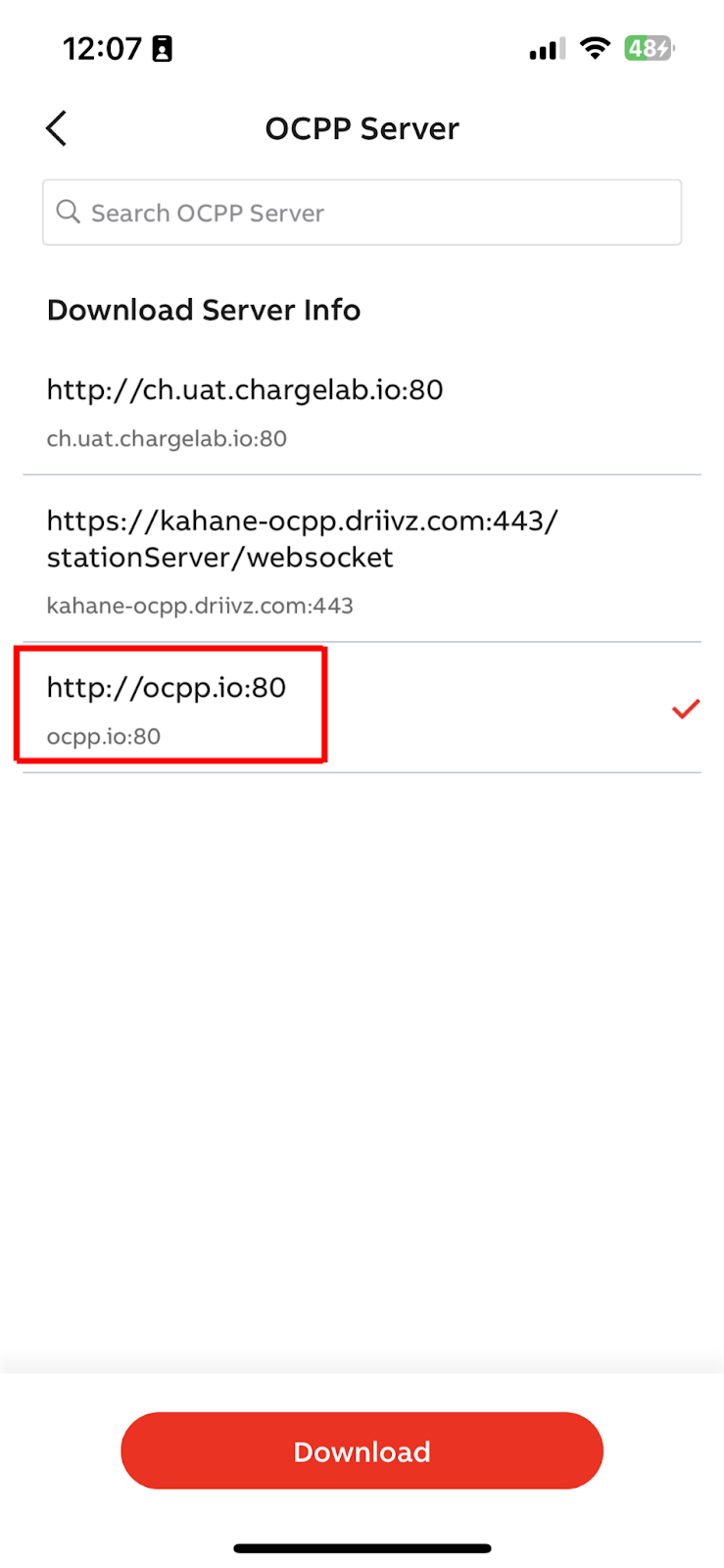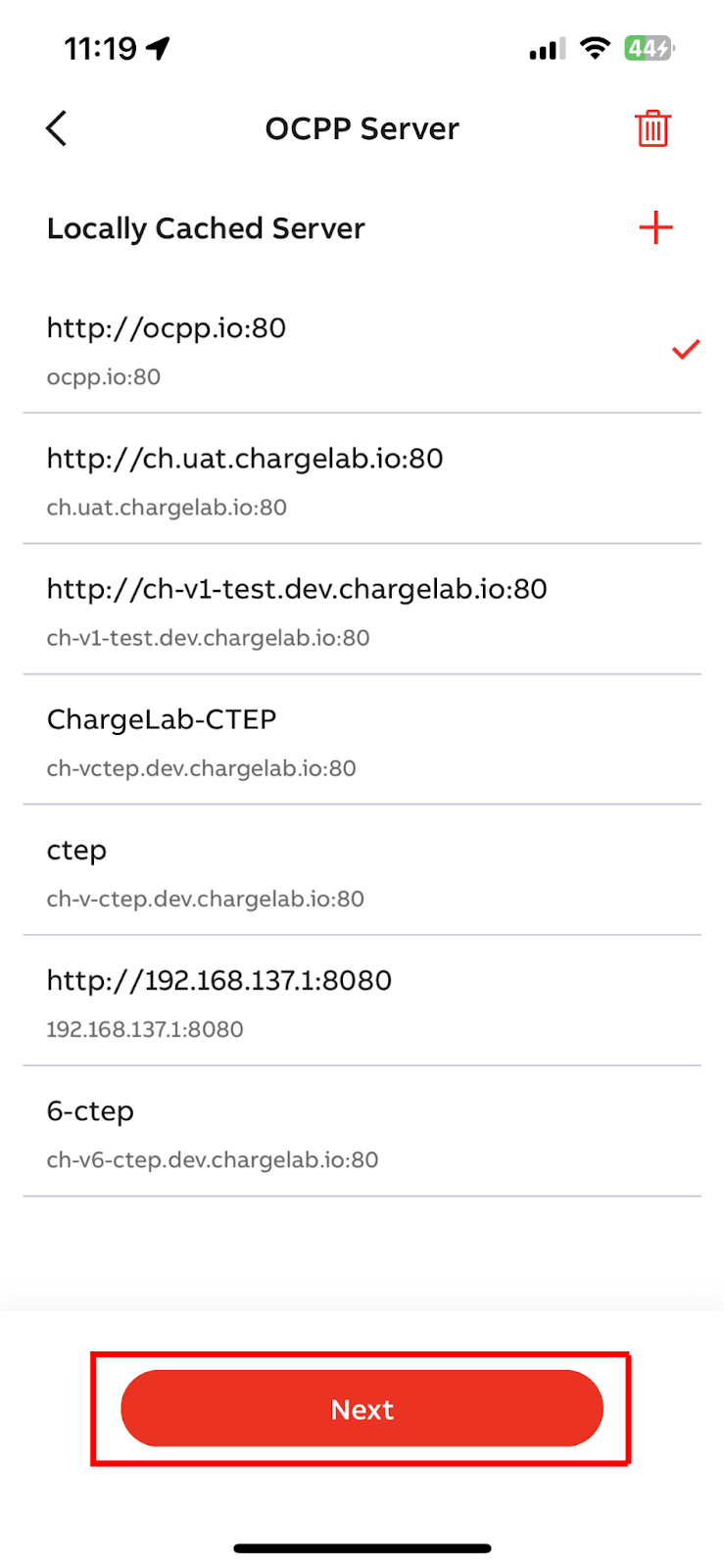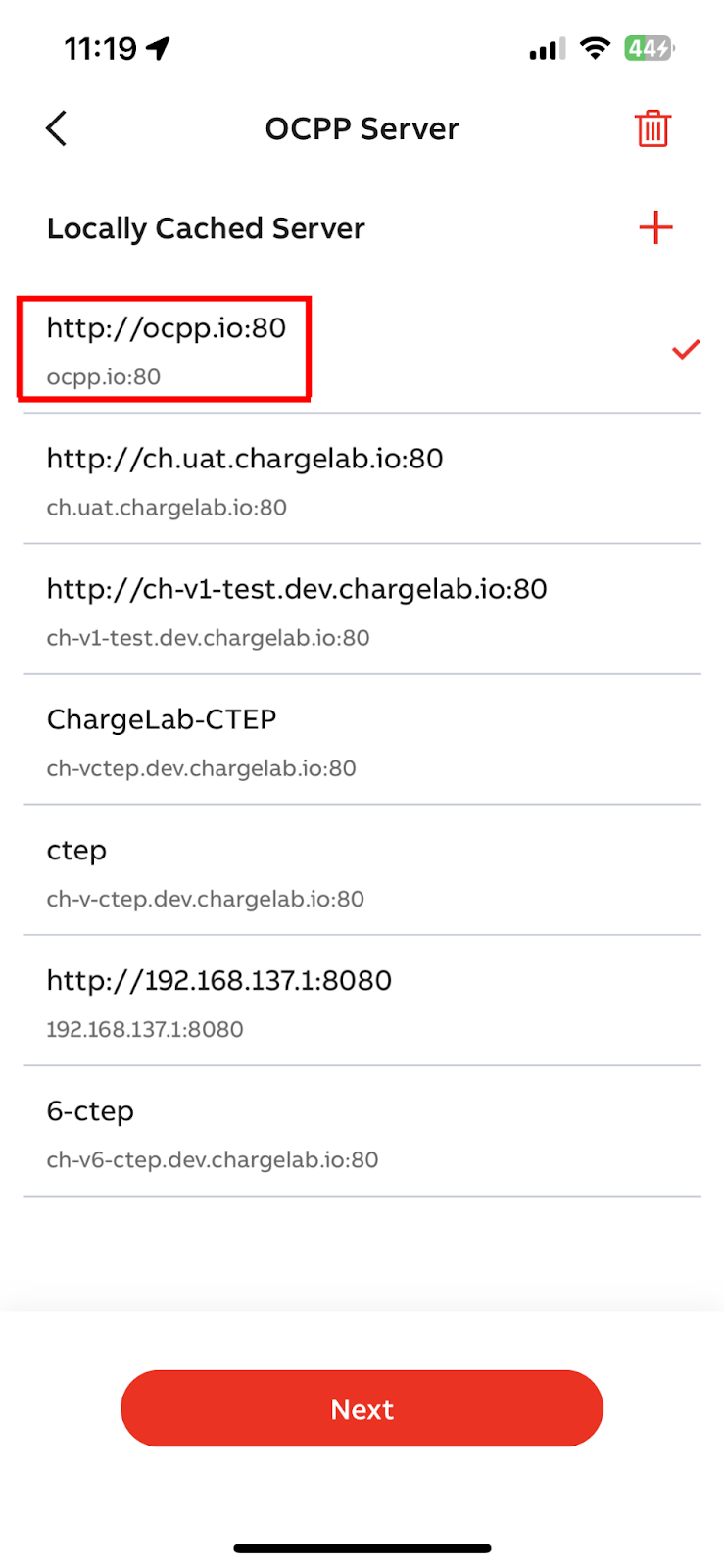 Select the + button (if http://ocpp.io:80 is already listed, skip to step 10)