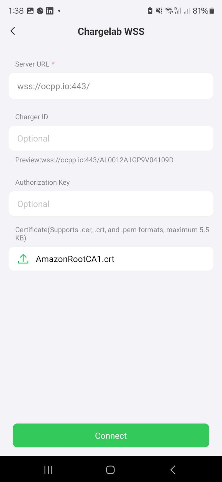 ChargeLab WSS - The connection will show up as successful